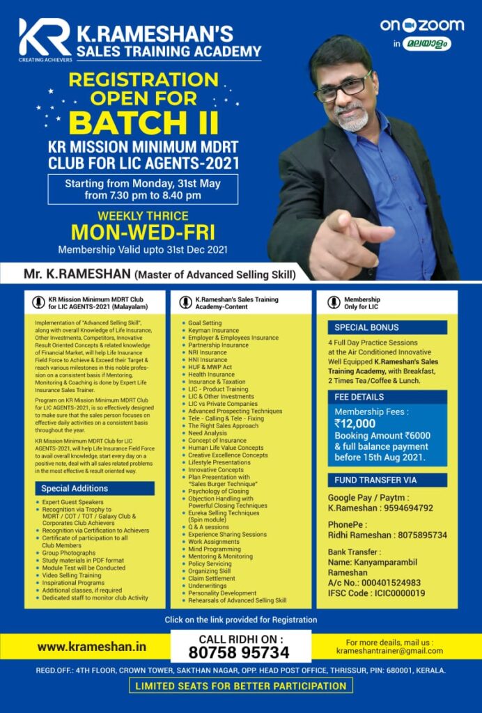 K.Rameshan’s Sales Training Academy has decided to keep the Scheduled Offline Classroom Sales Program at Trivandrum, Ernakulam, Calicut & Thrissur on Hold, till the COVID-19 situation gets normalized.